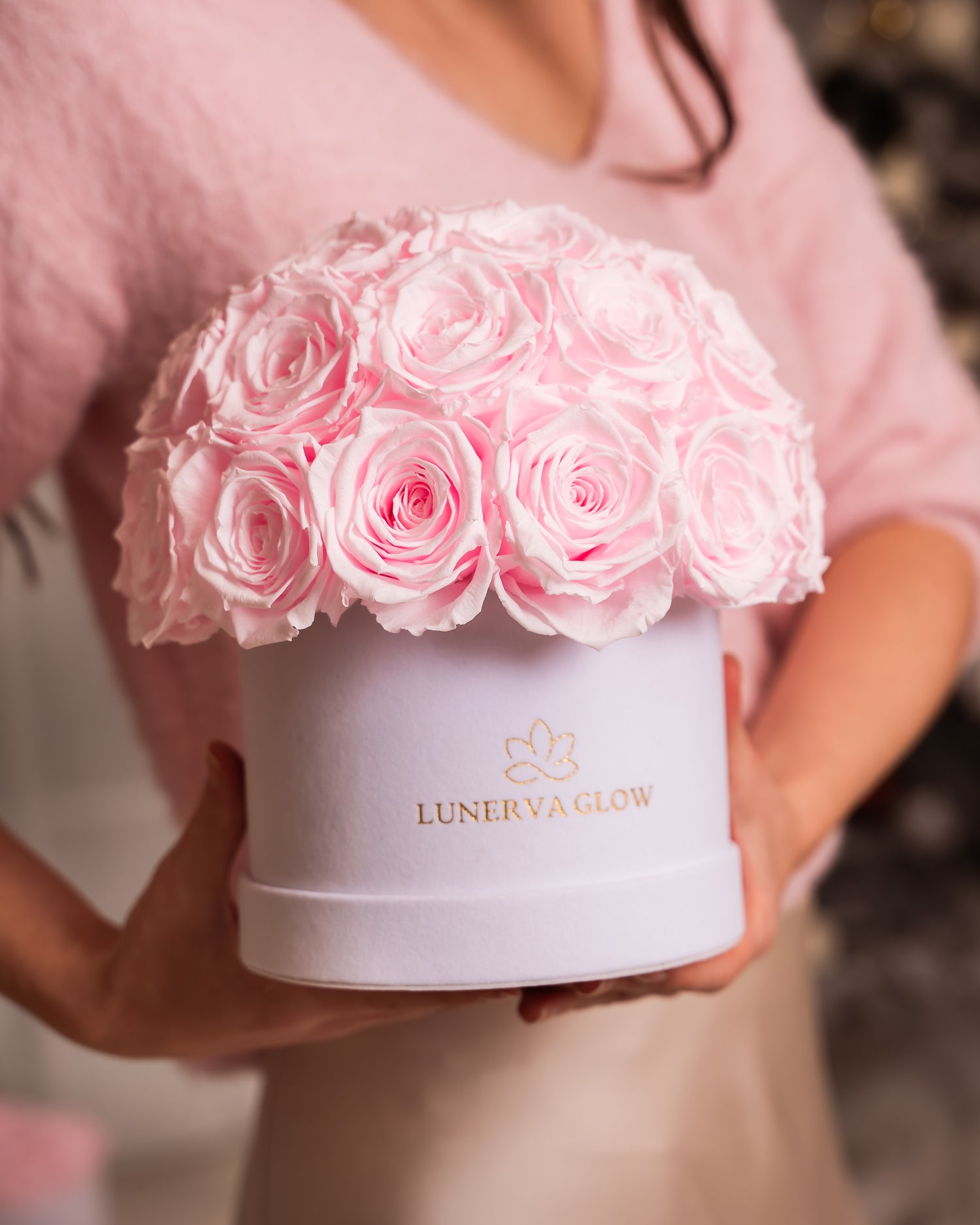 Unsere Kollektion umfasst vier zeitlose Nuancen: zartes Weiß für klassische Eleganz, zartes Bridal Pink für romantische Momente, warmes Beige für subtile F und tiefes Rot für leidenschaftliche Gefühle. Jede Farbe wird durch präzises Konservierungsverfahren perfekt konserviert. Die Blüten behalten ihre natürliche Textur, Farbintensität und botanische Qualität bis zu drei Jahre lang. Die Rosen werden individuell verarbeitet und in hochwertigen Präsentationsboxen arrangiert.